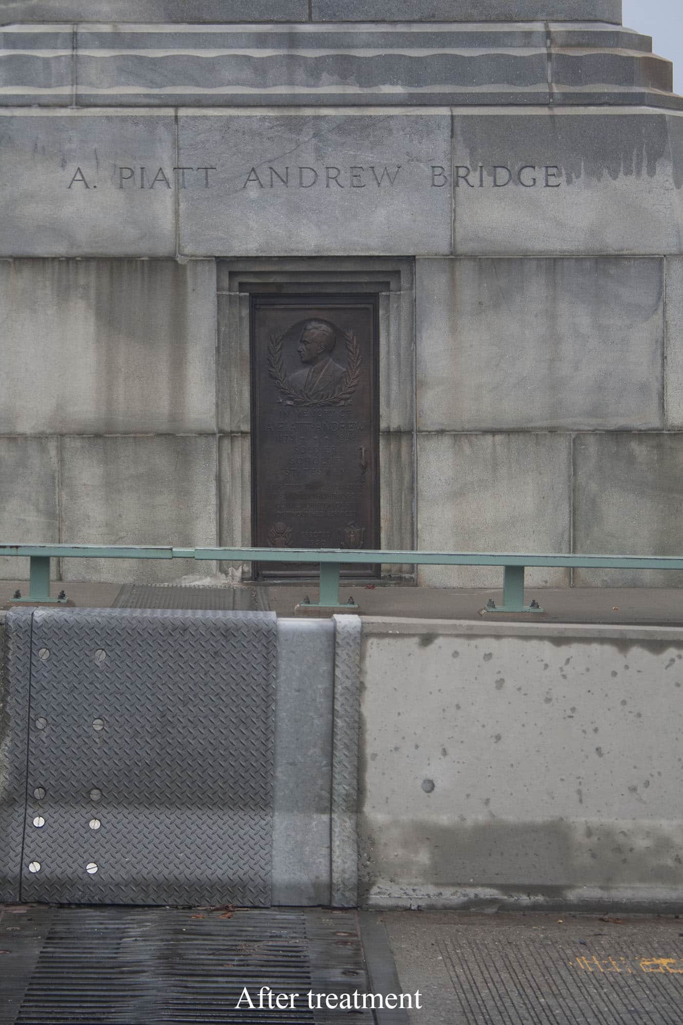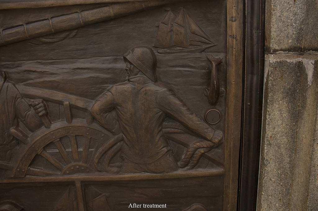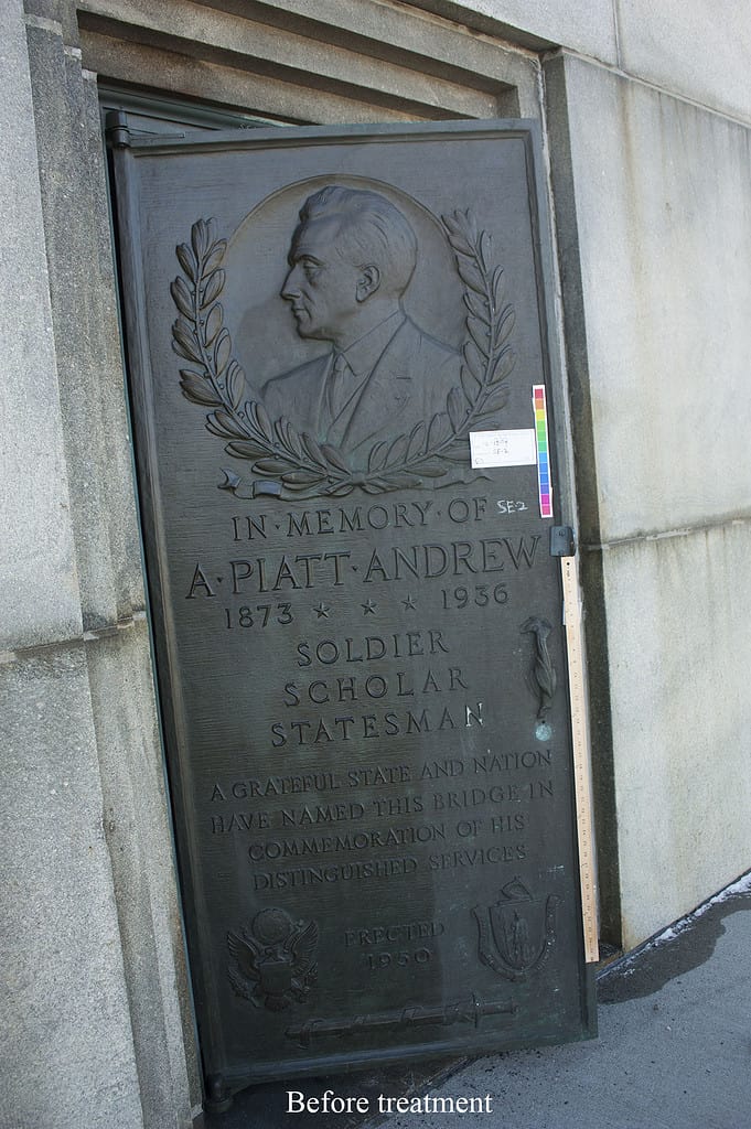 The four bronze doors on the bridge over the Annisquam River were installed in the 1950s. Sculpted by John Francis Paramino and cast by the foundry T.F. McGann & Sons, there are two designs, both cast in duplicate. One design depicts a portrait in profile of A. Piatt Andrew – the statesman who the bridge is named after – and the other illustrates scenes of fishermen and the harbor. Working in collaboration with Cianbro Corporation during the major rehabilitation of the bridge, we restored the bronze doors by cleaning them down to the original metal surface and applying a new patina and protective coatings. We also inventoried the doors and door components and repaired the door frames and other damaged components. We reinstalled these beautiful works of art in 2015.