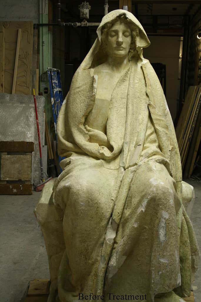 Robert and his team, in collaboration with the National Park Service, restored the archival plaster of the Adams Memorial held in the collection of the Saint-Gaudens National Historical Park in New Hampshire. The conservation treatment was performed in preparation for an exhibit at the Guggenheim Museum in New York City. The restoration included a reversible mechanical attachment system to the internal armature, removal of loose surface dirt, consolidation of all break edges, chips and losses, and reconstruction of larger losses.