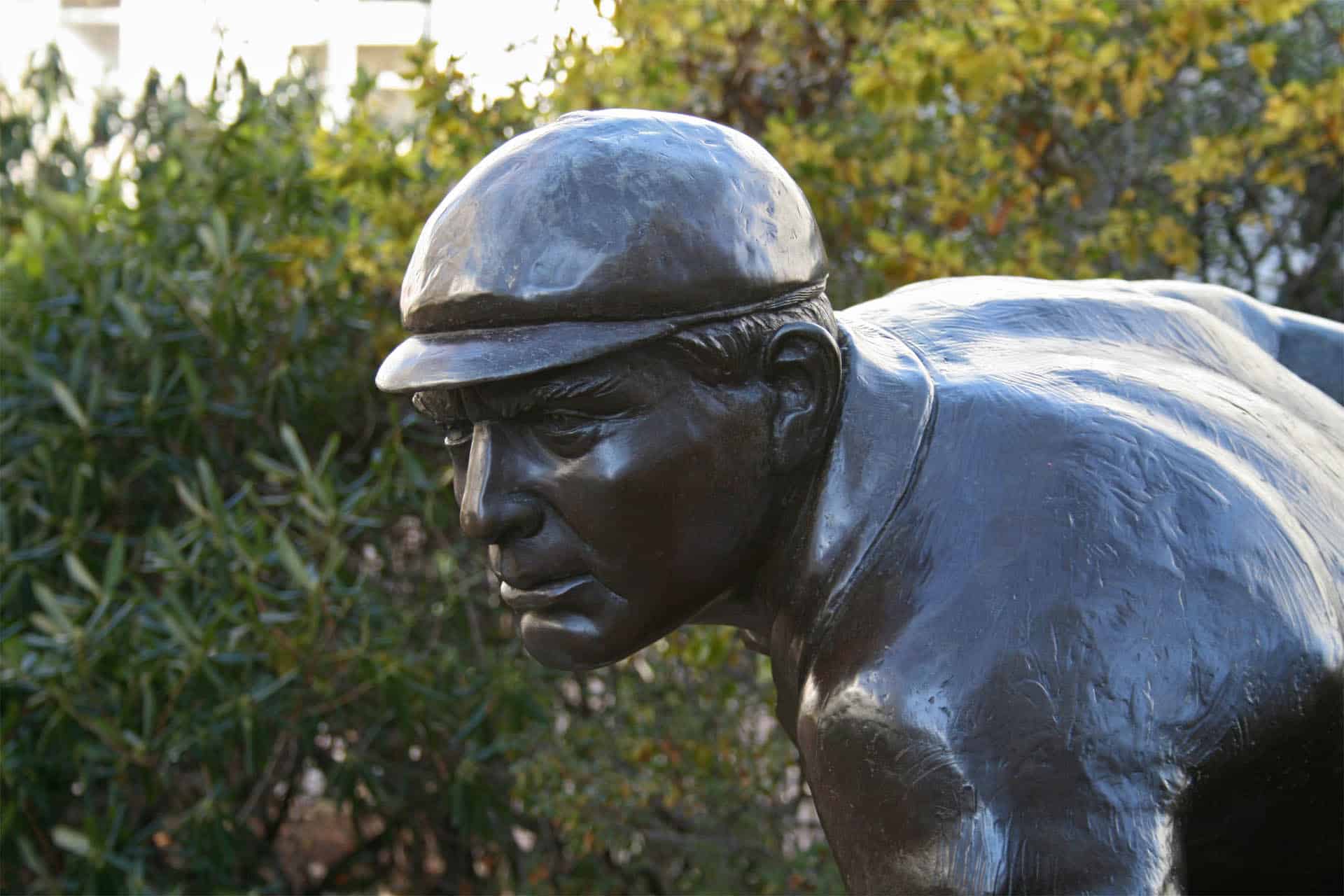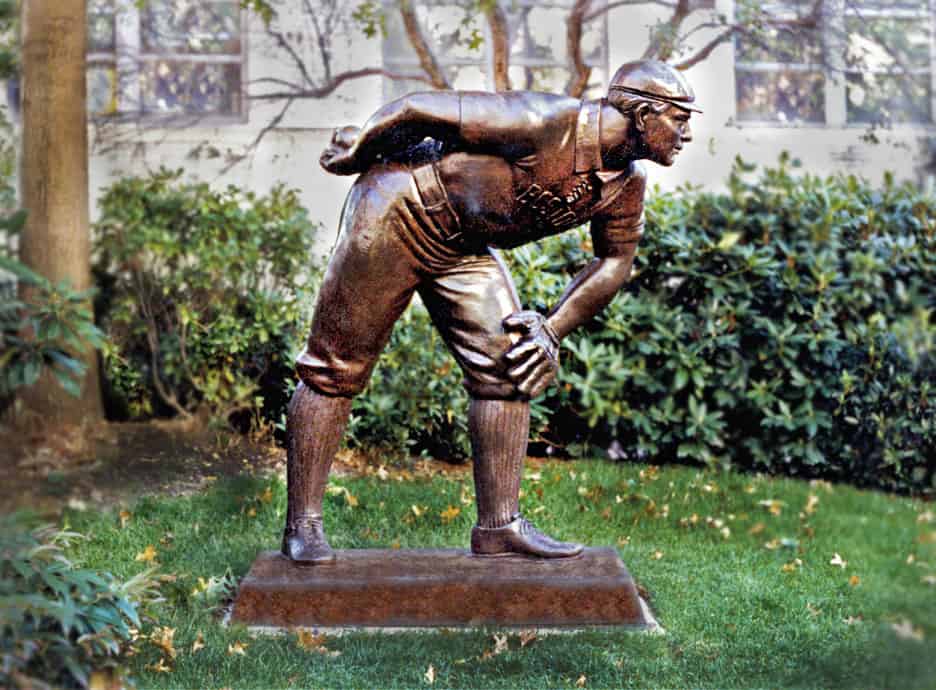 Cy Young, the winningest pitcher of all time, led the Boston Pilgrims (now the Boston Red Sox) to a championship at the First World Series in 1903. The Pilgrims played this historic series at the Huntington Avenue Grounds which was Boston’s first ballpark predating Fenway Park. The Grounds, since being demolished, is now incorporated into Northeastern University’s campus. In the statue, Young is in the classic pitcher’s stance concentrating on the batter, the sign from the catcher, and his next pitch.