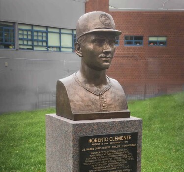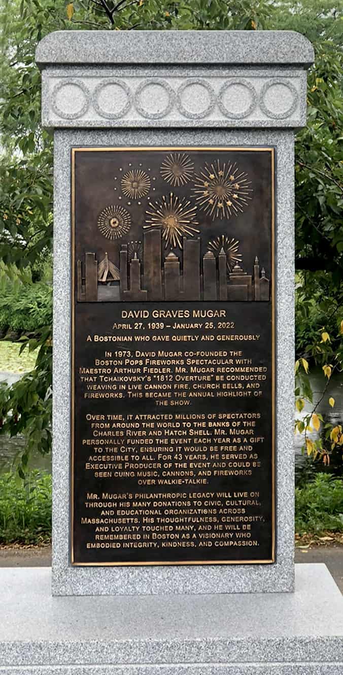 David G. Mugar (1939-2022) co-founded the renowned Boston Pops Fireworks Spectacular that has been performed annually on the 4th of July since 1973. He personally funded the event and also donated to many Massachusetts organizations over the years. After Mr. Mugar’s passing, his company and family desired to commemorate his generosity in the park where the Spectacular is held – on the Charles River Esplanade. The monument is an 8-foot-tall bronze statue of Mr. Mugar standing atop a granite base. Beside the statue is a podium-like piece of granite with a bronze plaque that describes Mr. Mugar’s contributions to the Spectacular and his community. As Robert learned about Mr. Mugar during the sculpture creation process, he felt that he became spiritually connected to him; he hoped he could emulate Mr. Mugar in terms of his generosity and kindness.