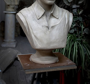 sculpture of two figures on round granite base on a walkway in front of a stone building