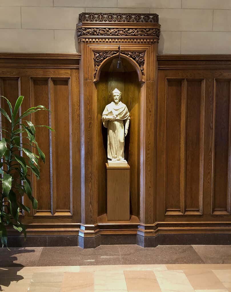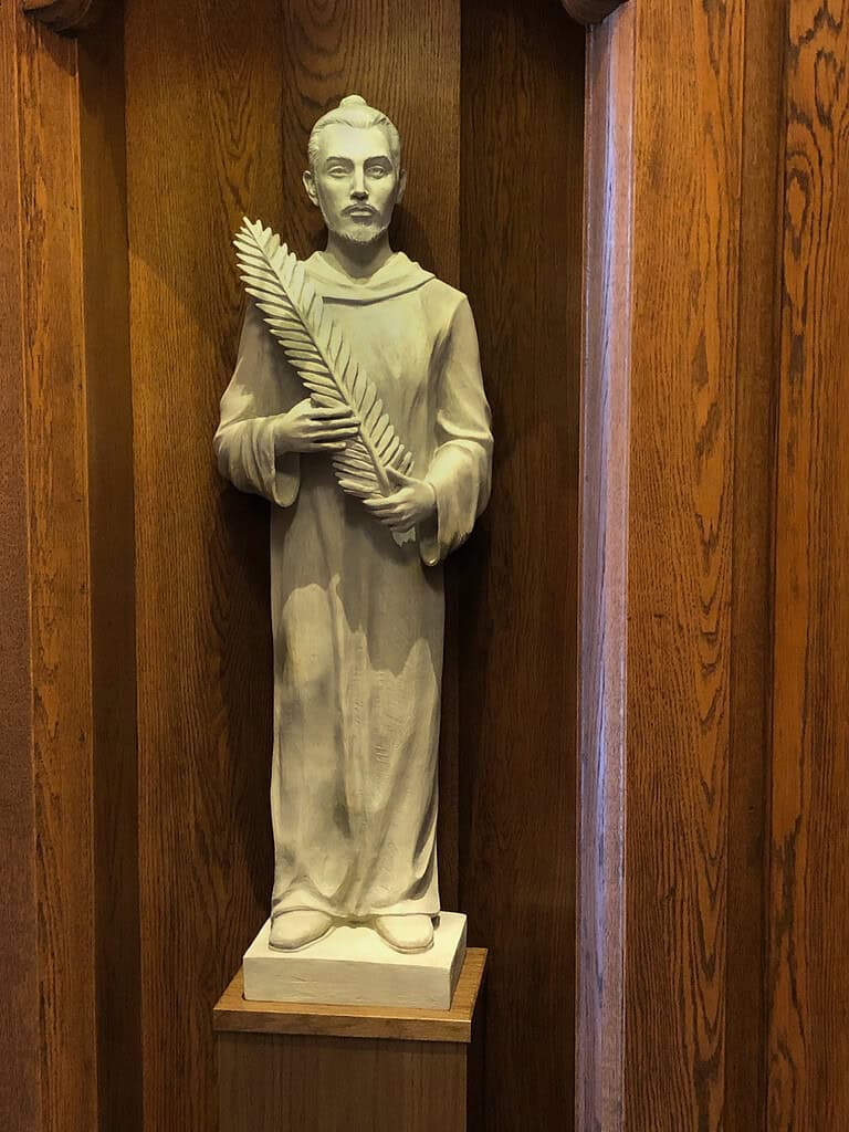St. Mary’s Chapel and Boston College commissioned us to create six statues for niches that were never filled after the chapel’s construction in 1917. The Chapel – a Jesuit church – desired to display portraits of Jesuit saints for its congregation and wider community. They chose St. Robert Bellarmine, St. Alberto Hurtado, St. Ignatius Loyola, St. Paul Miki, St. Joseph Pignatelli, and St. Francis Xavier. These men contributed in varying ways to the Jesuit cause and to humanity, such as performing missionary work, promoting social justice, leading the Catholic Reformation, and authoring works for the Society. Two of them were founders of the Society of Jesus itself. We researched the historical imagery of the saints as well as their biographies and legacies to design compositions that would express their work and faith.