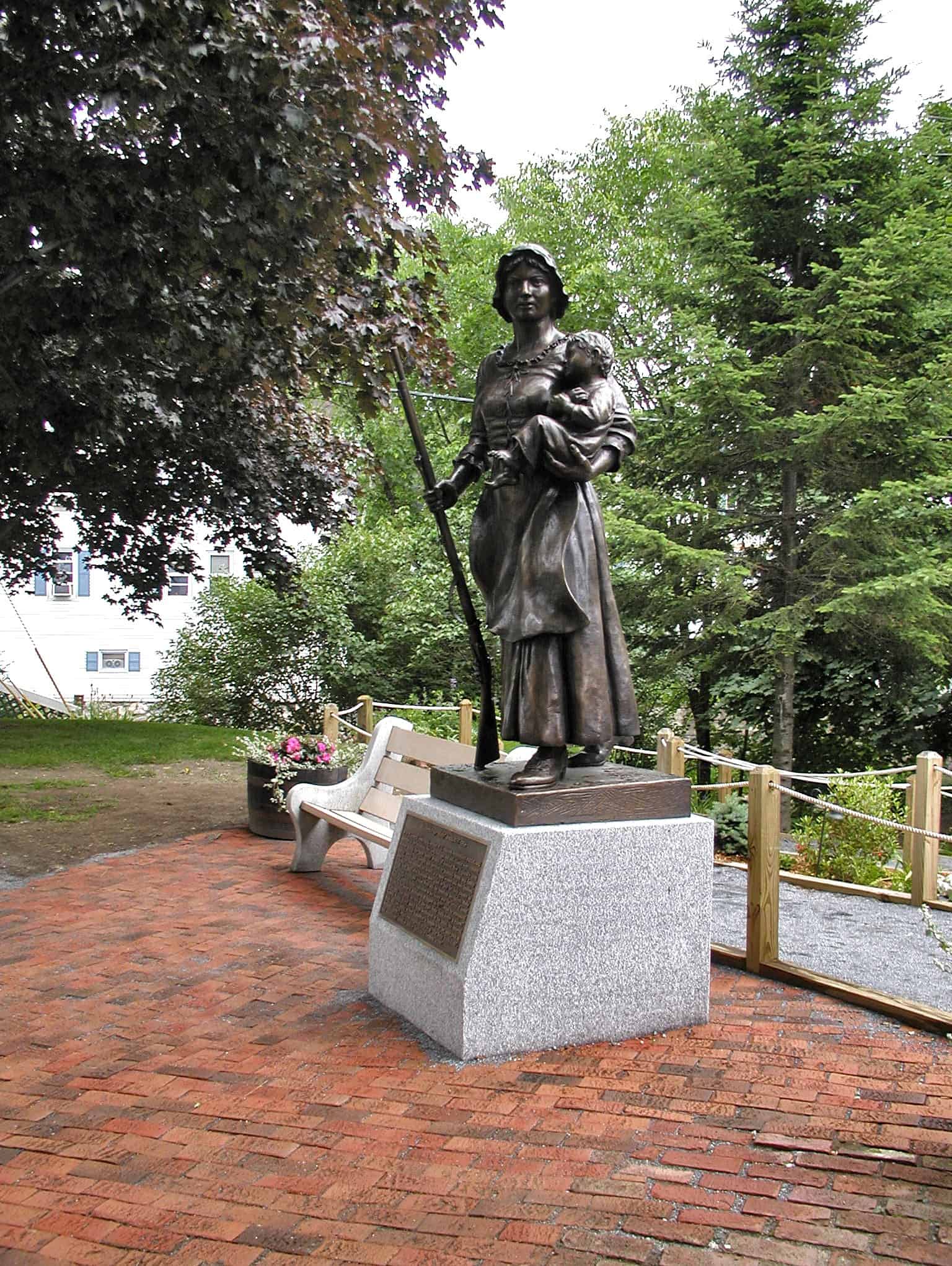 Molly Stark was the wife of General John Stark and the mother of 11 children. During the American Revolution, she was always ready to support John and his troops, such as being their nurse when many developed smallpox and opening up their home as an infirmary. She is shown here with a baby in one arm, a flintlock musket in the other, and striding forward. The over life-sized sculpture is located on the historic Molly Stark Trail in Wilmington, Vermont.