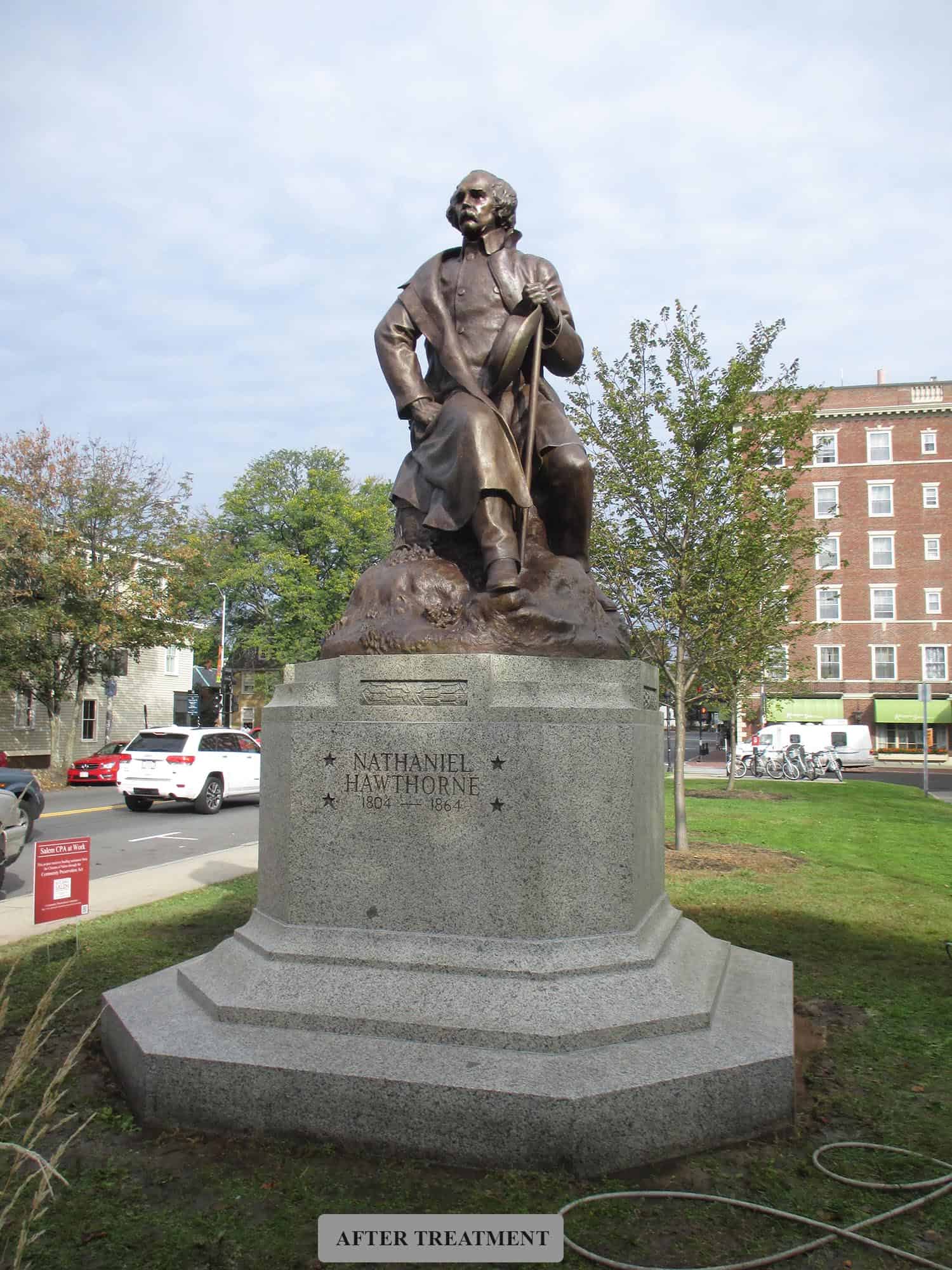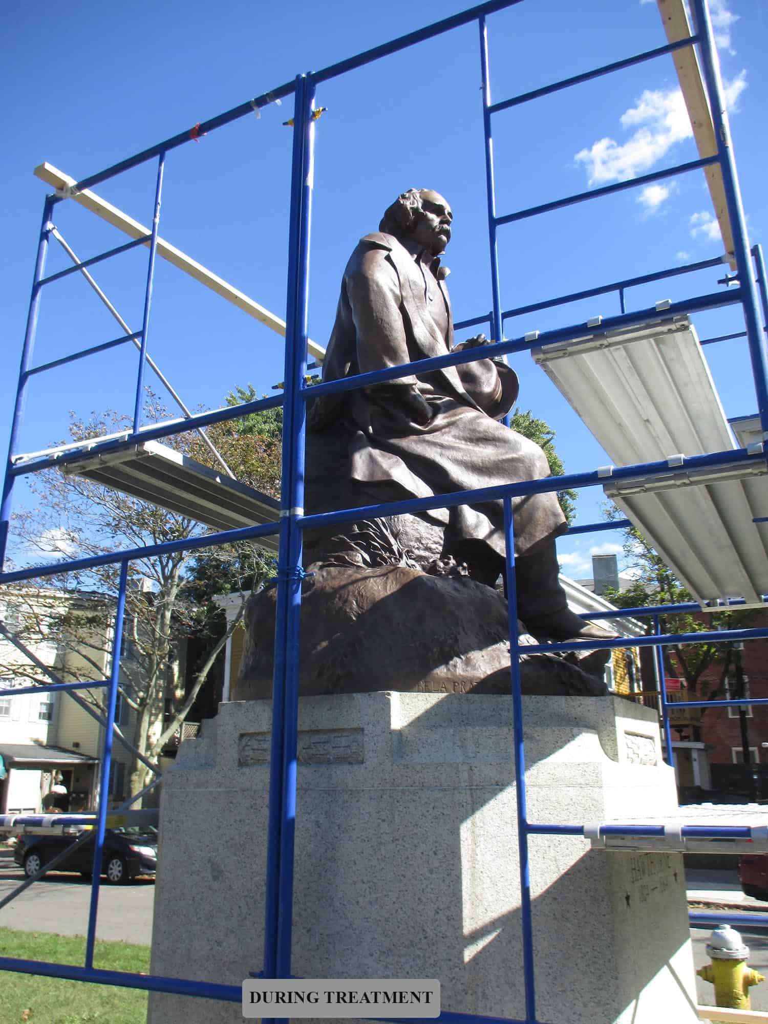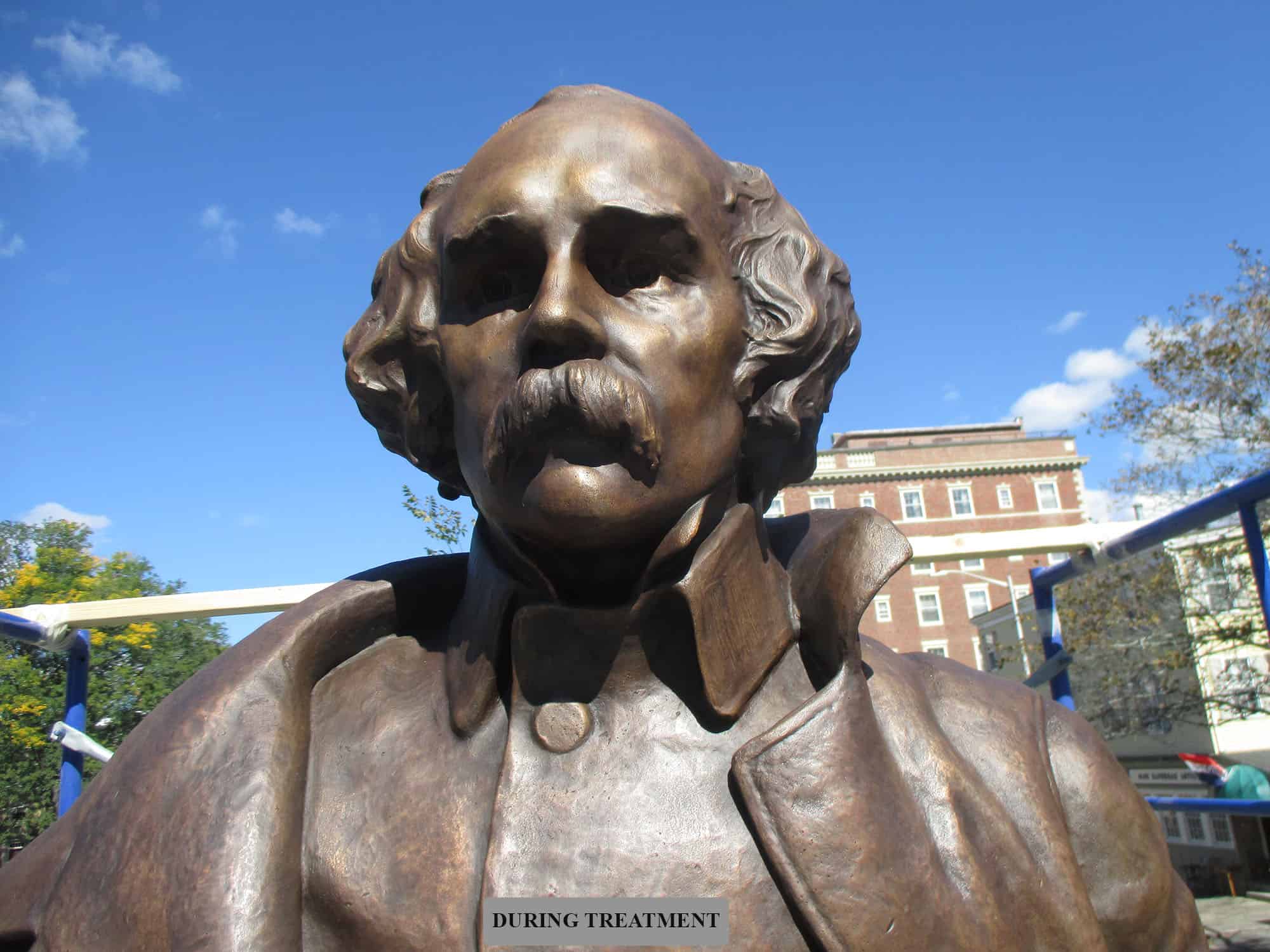 Located on Hawthorne Boulevard, the monument consists of a 9-foot-high bronze sculpture of the famed writer sitting on a rock atop a large granite base. The treatment completed in 2017 included cleaning the granite base, repointing the joints of the granite, cleaning the bronze, renewing the bronze’s patina, and applying protective coatings of incralac and wax to the bronze.