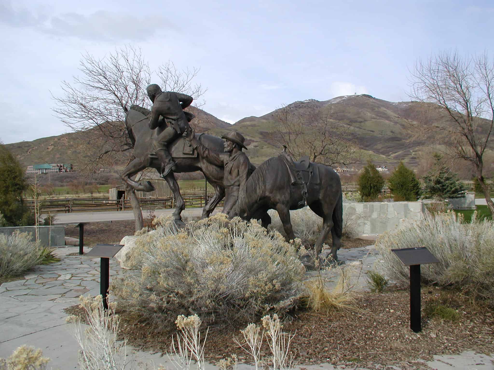 The monumental-sized replication called “Changing Horses” is located along the Pony Express National Historic Trail on the grounds of This Is the Place Heritage Park in Salt Lake City, Utah. The original was designed by the noted sculptor Avard Fairbanks in the mid-20th century but never created. Robert Shure and Skylight Studios sculpted the design in clay in collaboration with Avard Fairbanks’s sons and then had it cast in bronze and installed on site. Later a second copy was cast and placed along the Trail in Casper, Wyoming. The sculpture is an astounding 25 feet long and 22 feet high.