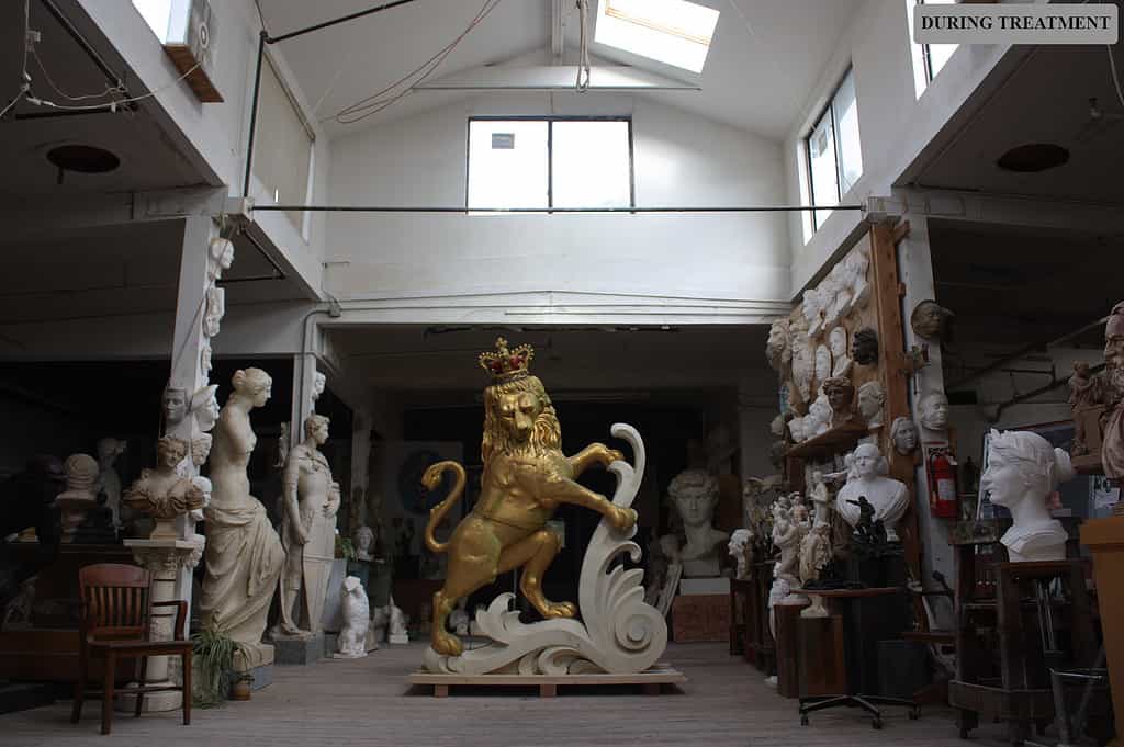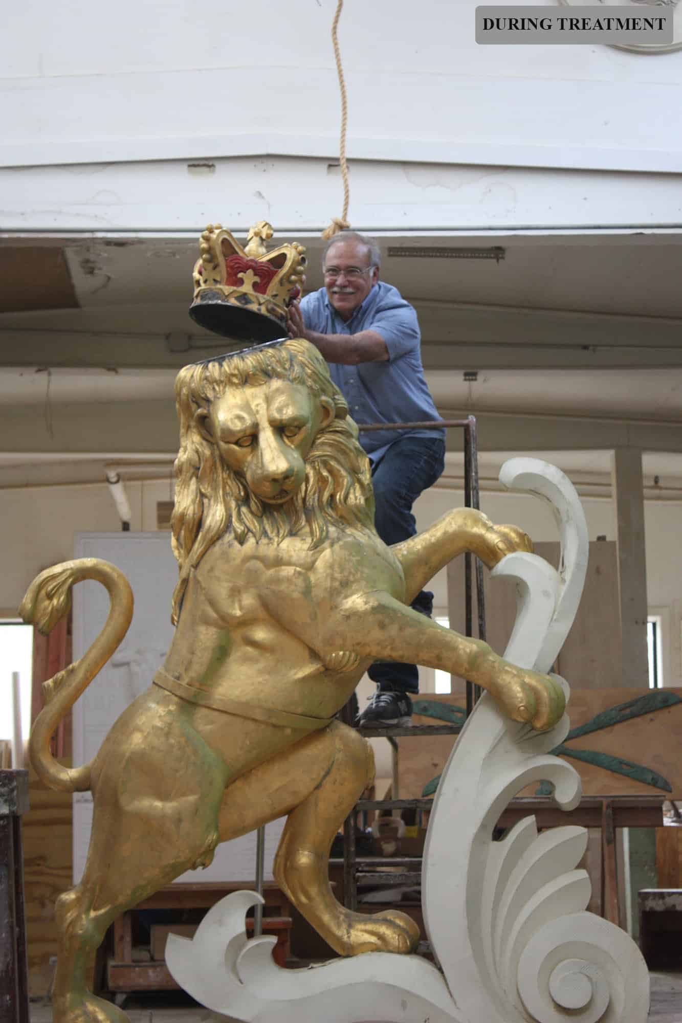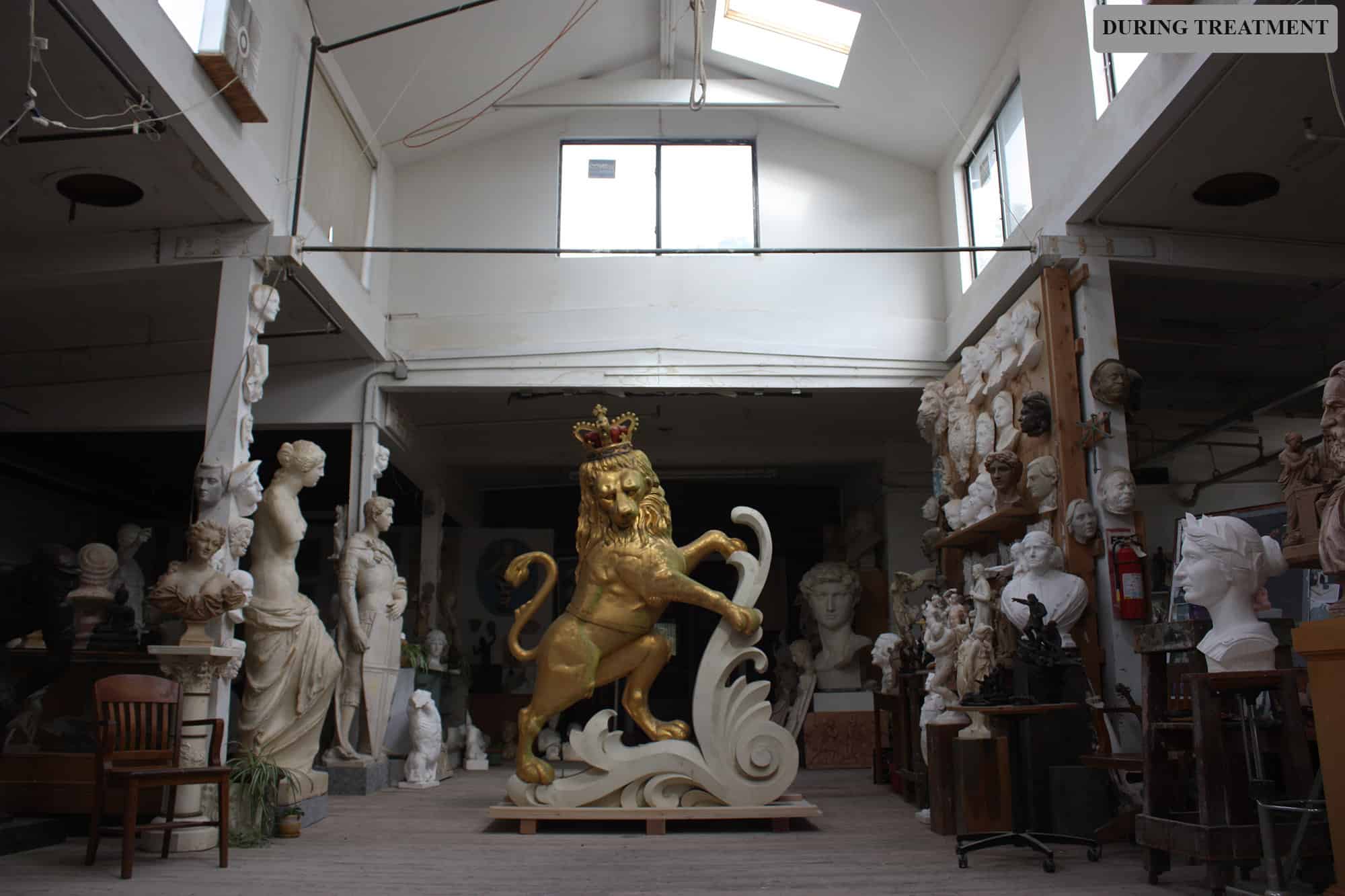 By 2014, the Lion and Unicorn sculptures that grace the roof of Boston’s Old State House were in need of restoration. Robert and his team had performed restorations on these sculptures in the past, and the Bostonian Society (now Revolutionary Spaces) and the National Park Service reached out to Robert. The Lion and Unicorn were deinstalled and restored in our studio. The restoration included re-gilding the copper sculptures. The head of the lion held a time capsule which was relocated to the base instead.