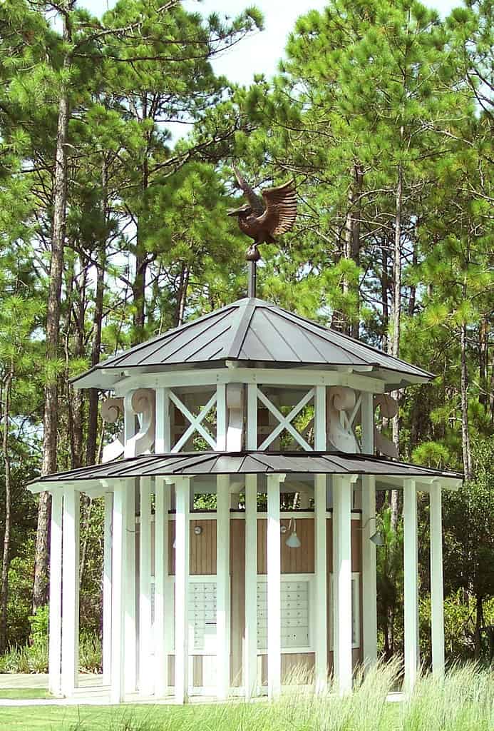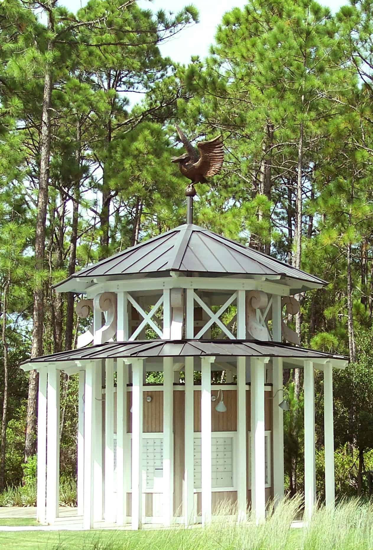 The over-sized bronze pelican, with letter in beak, sits on top of the mail kiosk at this private estate. Architecture by Gund Partnership of Cambridge, Massachusetts.