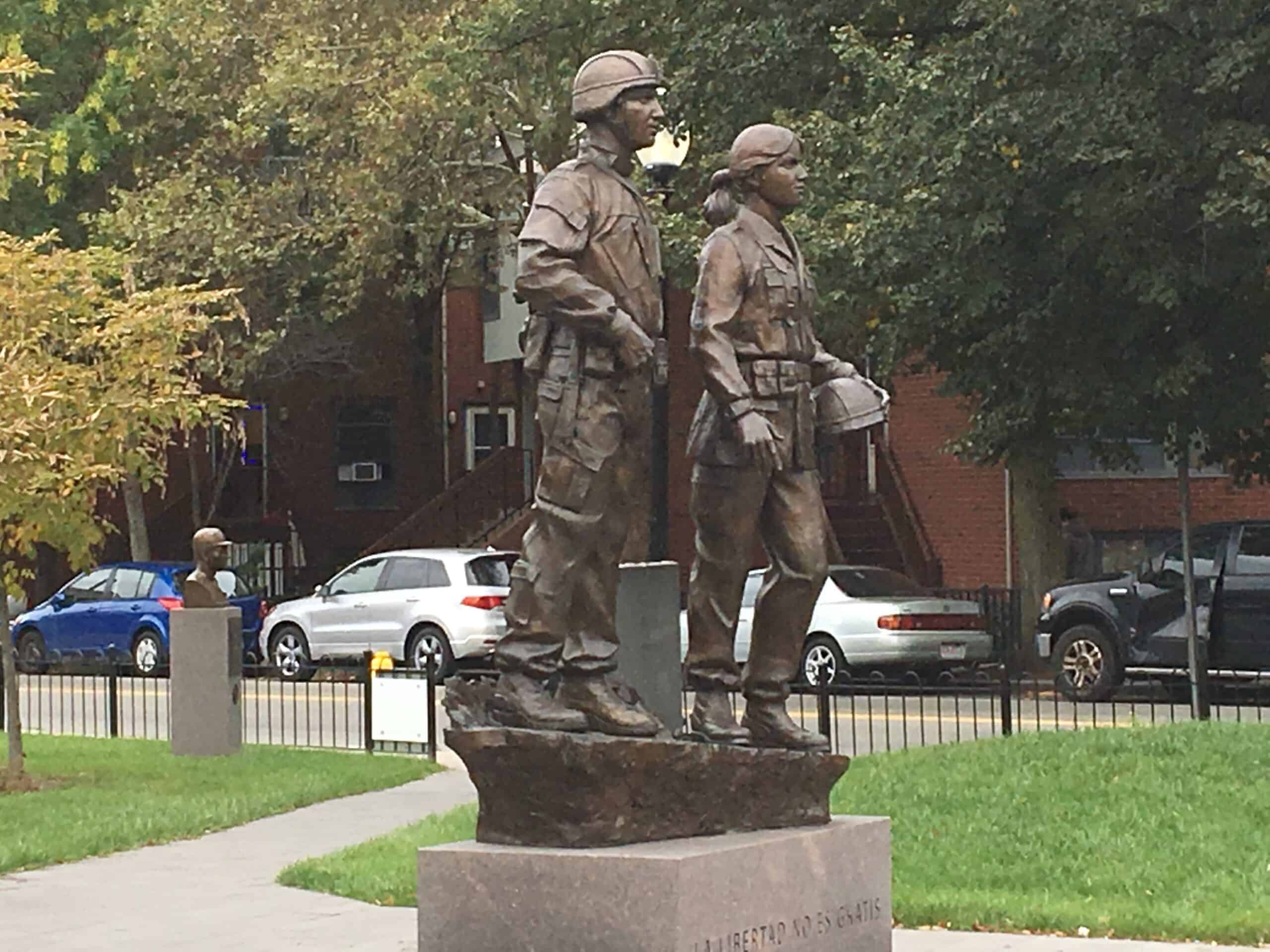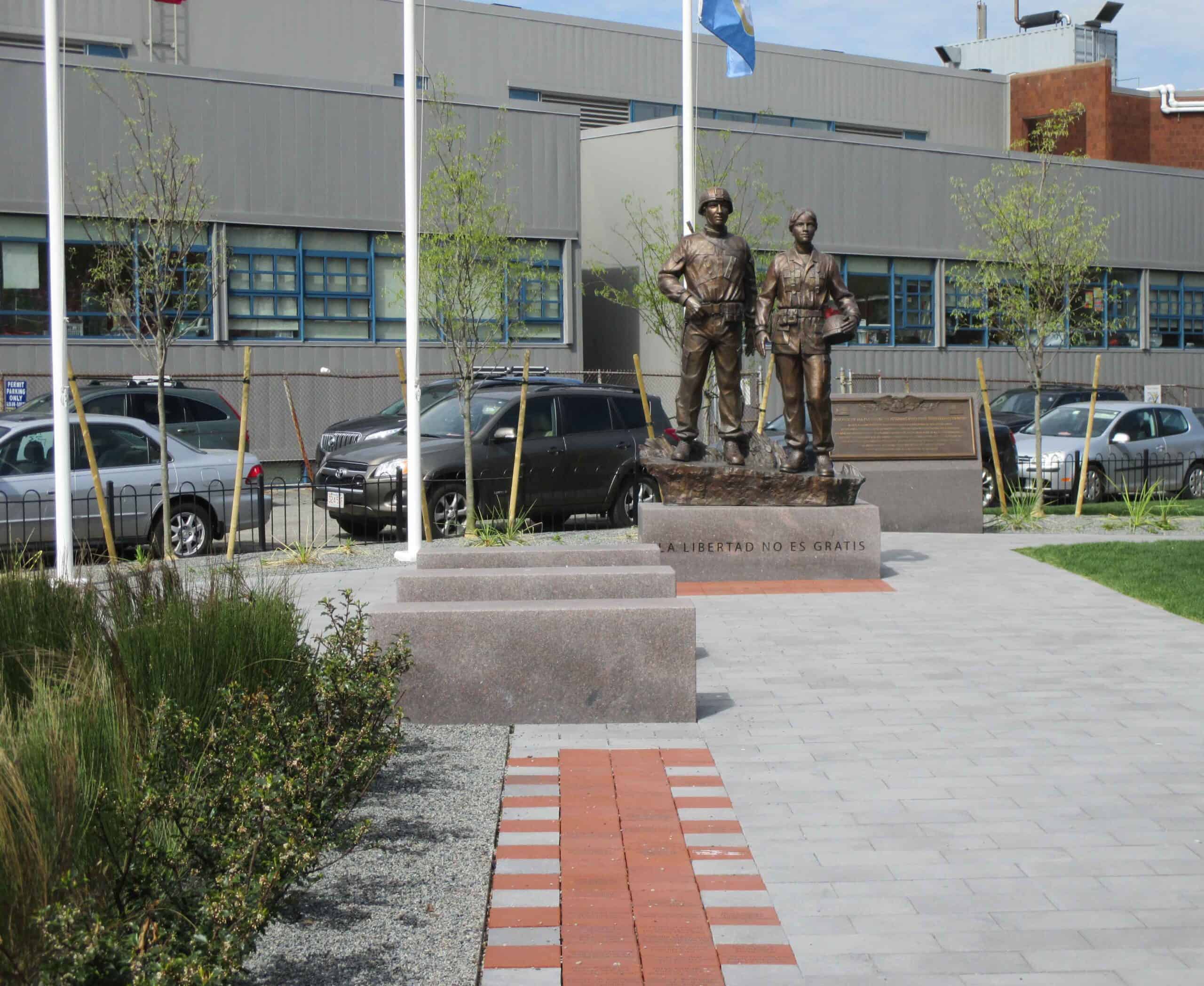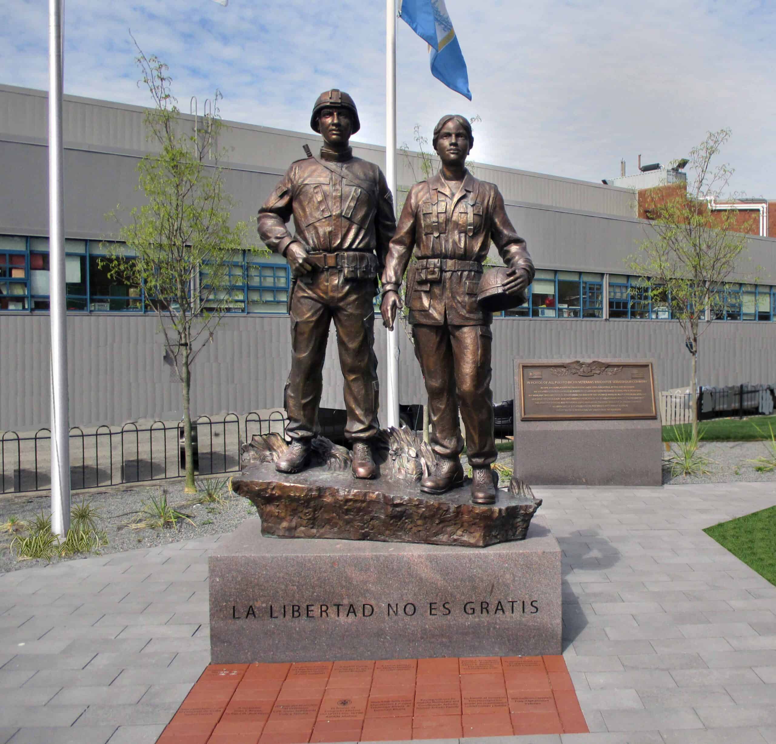 A memorial to all Puerto Rican veterans who served the USA. The plaza includes engraved donation bricks, engraved granite posts, and bronze plaques. The focal point is a sculpture of two soldiers, the male wearing the contemporary Army Combat Uniform and the female wearing the Desert Camouflage Uniform. Memorial services and community events are held annually at the site. Robert has added two memorials to the site since its dedication: the Roberto Clemente Bust and the Purple Heart Monument.
