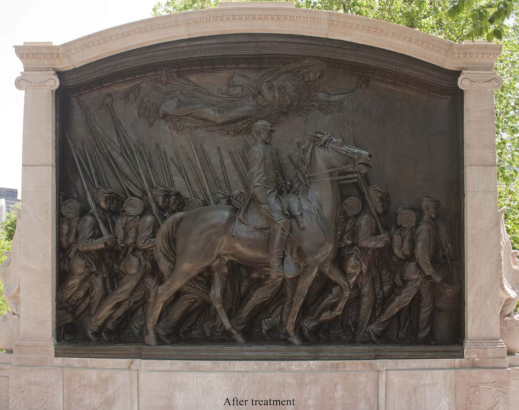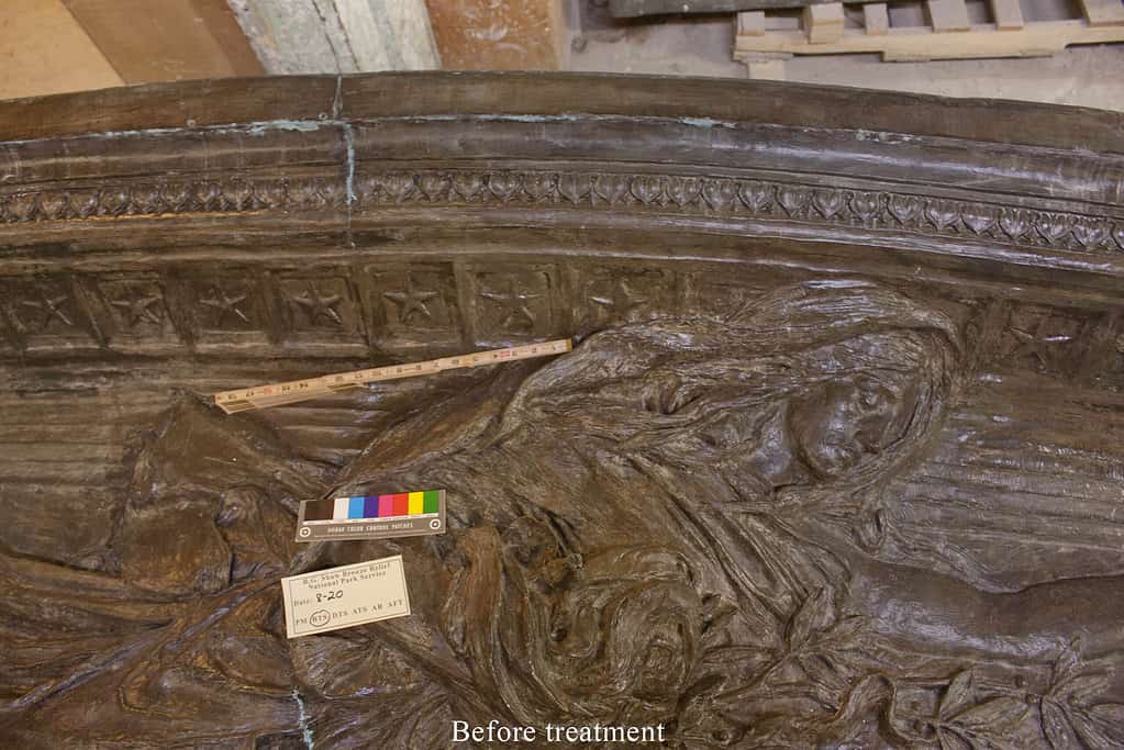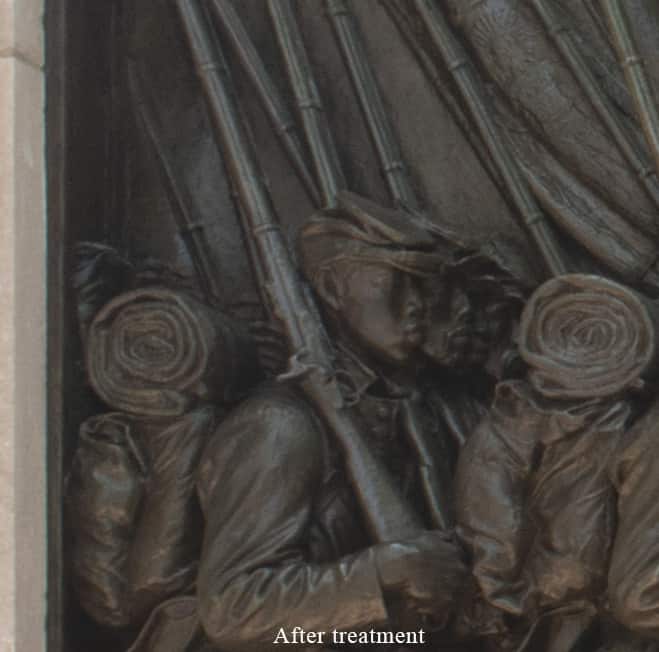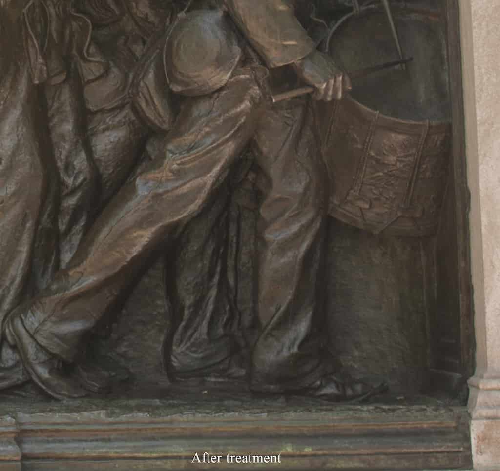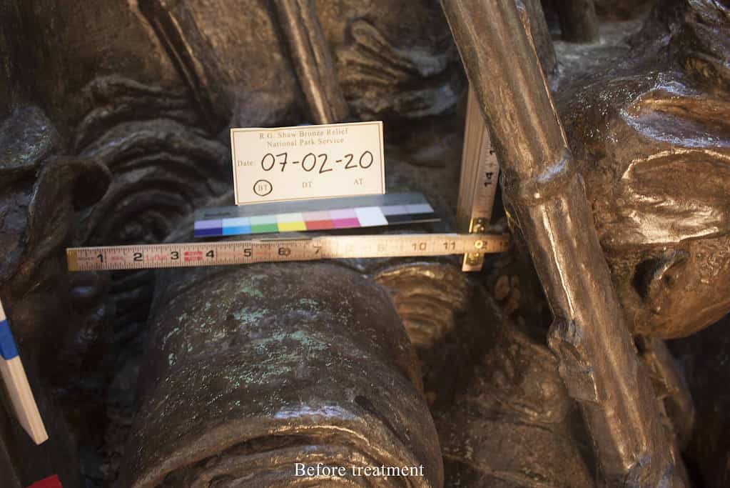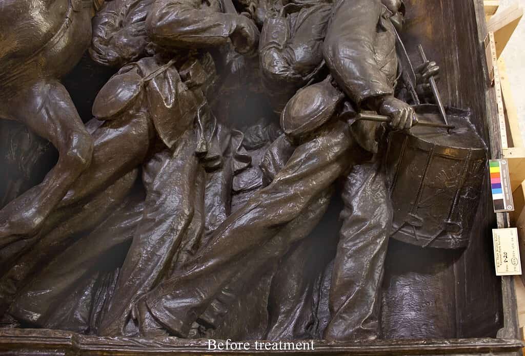 The memorial by Augustus Saint-Gaudens (1848-1907) on the Boston Common consists of a large bronze relief approximately 11’-6” high by 14’ wide set within a stone surround. In 2020 to 2021, the National Park Service, the City of Boston, the Friends of the Public Garden, and the Museum of African American History coordinated a major restoration of the memorial. We were part of a team of conservators and specialists tasked with ensuring the safe restoration, deinstallation, transportation, and reinstallation of the bronze relief. Work was performed in the studio to restore structural damage to the bronze including the recreation of Shaw’s sword blade in PVC and to clean the bronze, renew the patina, and apply protective coatings of incralac and wax.
