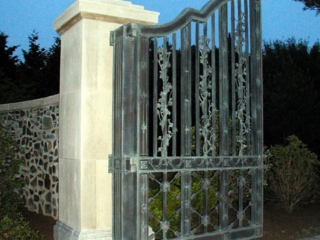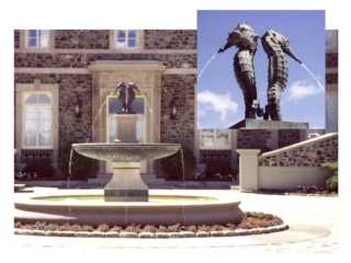The seahorse fountain is located in the courtyard of a seaside estate. The custom bronze gate features dogwoods and decorative elements in order to complement similar details on the house.