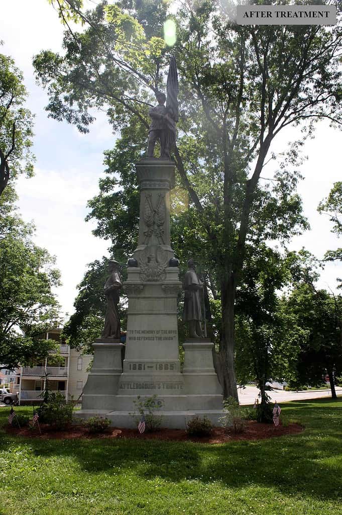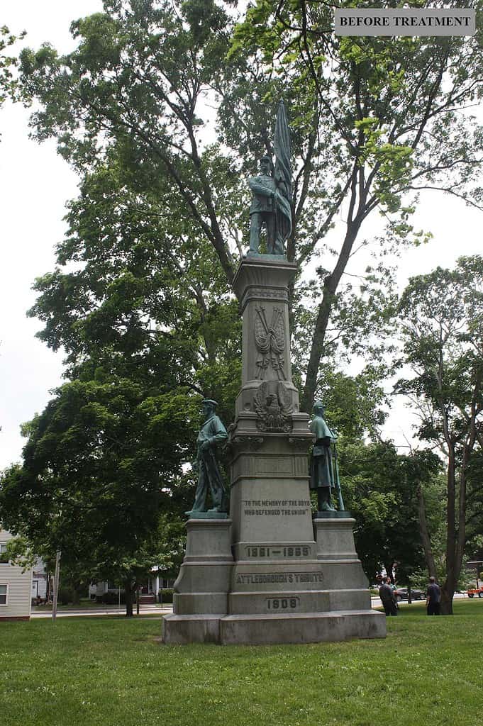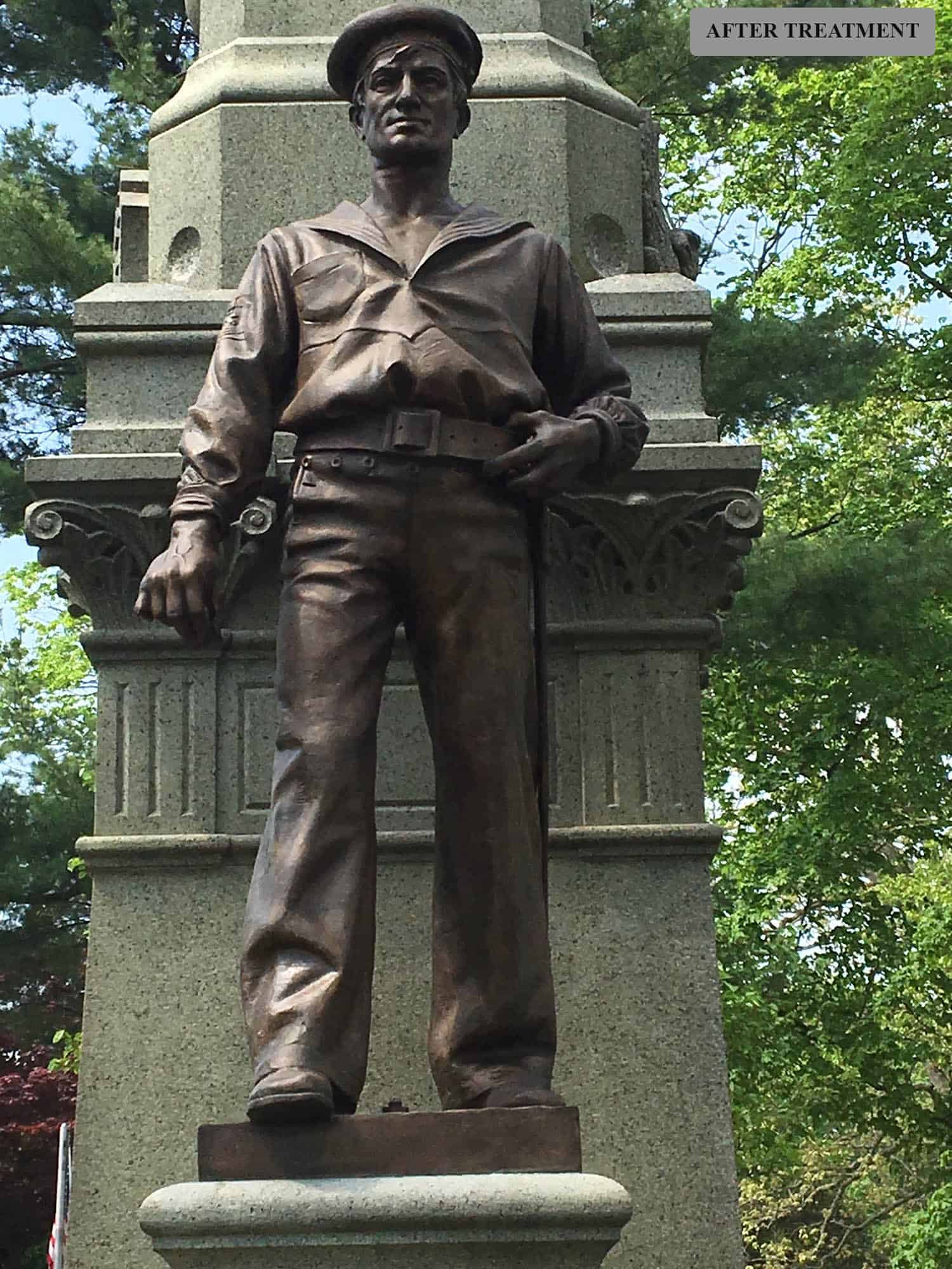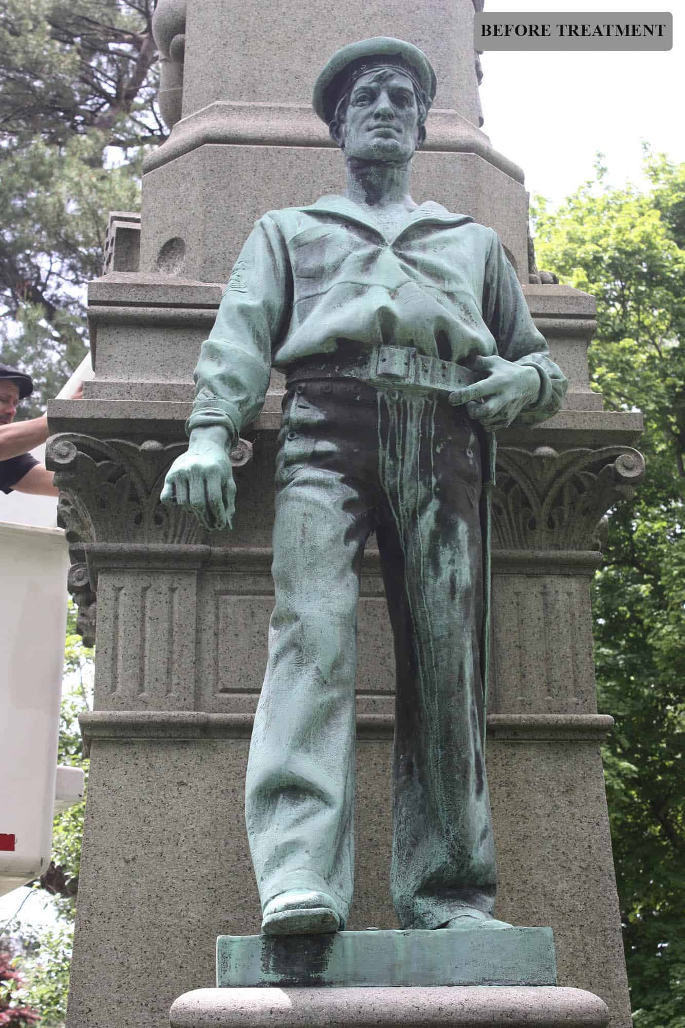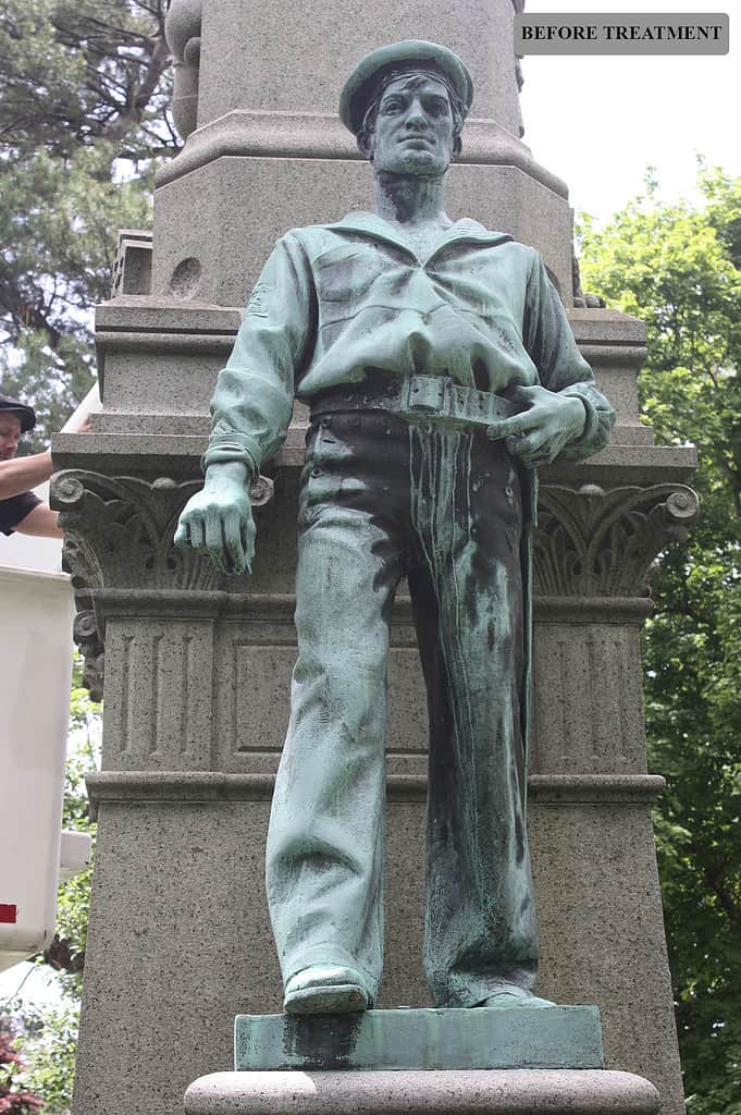 Three bronze figures adorn a tall, approximately 35-foot-high granite shaft with two wings at its sides. In 2019, work was performed to better secure the Flagbearer statue, recreate the four missing cannonballs in granite, recreate the Sailor statue’s sword in bronze, clean the granite base, remove corrosion from the bronzes, renew the bronzes’ patina, and apply protective coatings of incralac and wax to the bronzes.