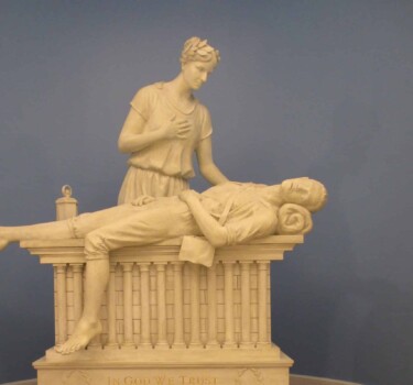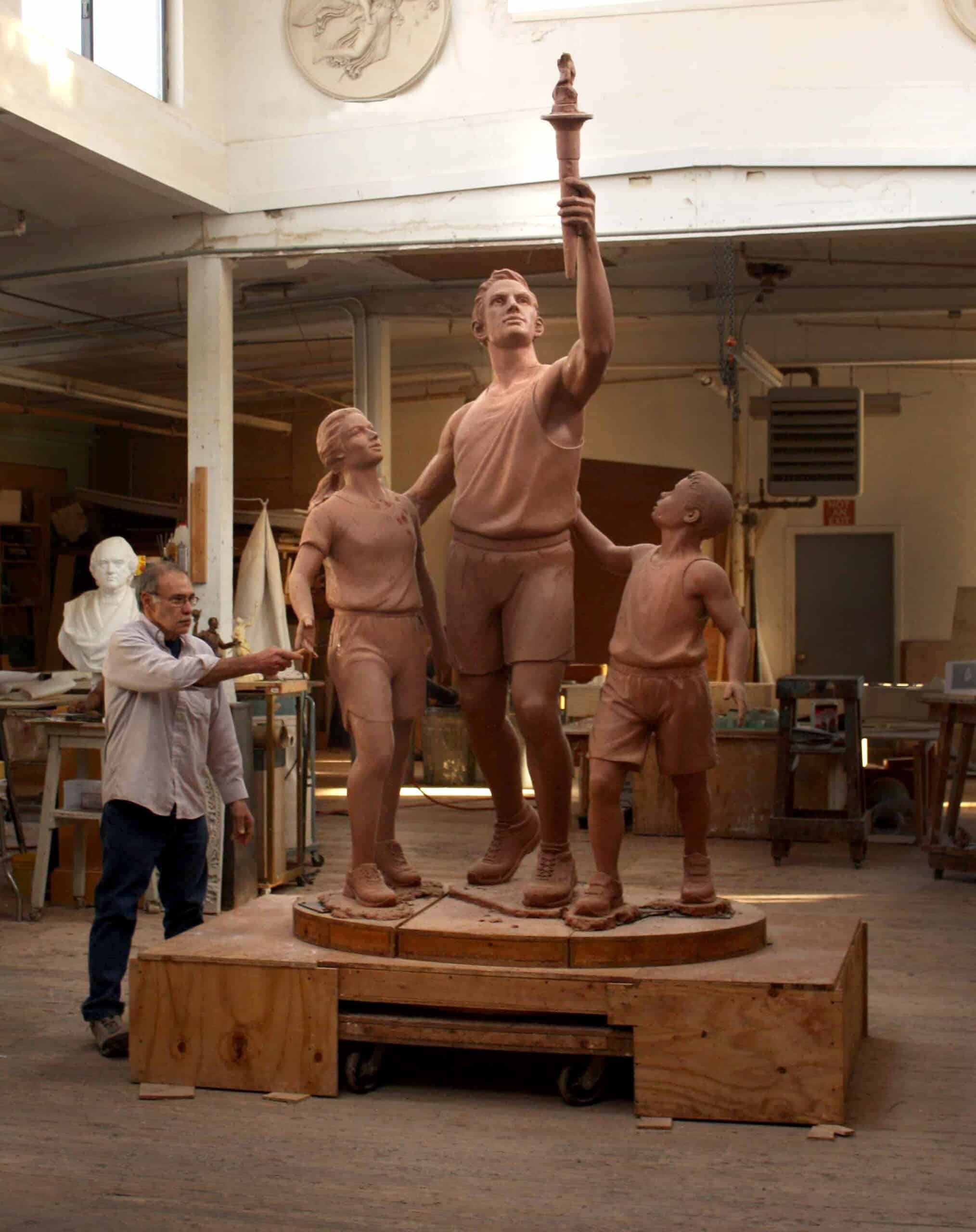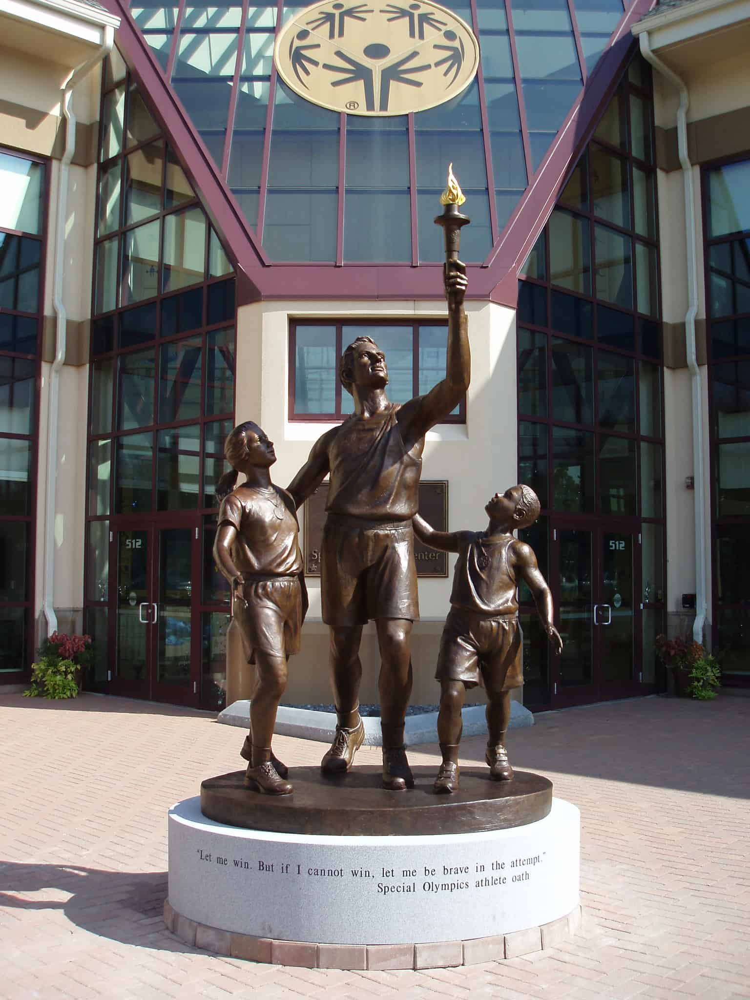 This monument is located at the entryway of the then newly-built Yawkey Sports Training Center – the headquarters of Special Olympics Massachusetts. The central figure is the coach striding forward and holding the Special Olympics torch. The flame itself has a gold leaf finish and an internal, flickering LED light. Beside him are the young athletes looking towards their coach and the torch. The sculpture symbolically represents the efforts, participation, and accomplishments of all the Special Olympics athletes.