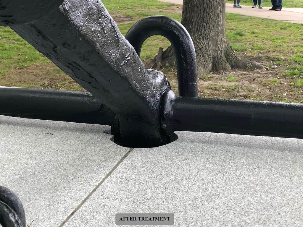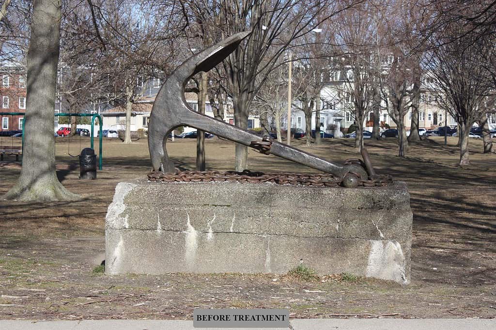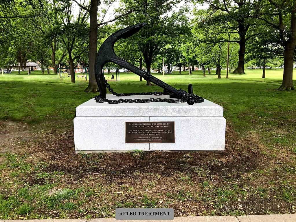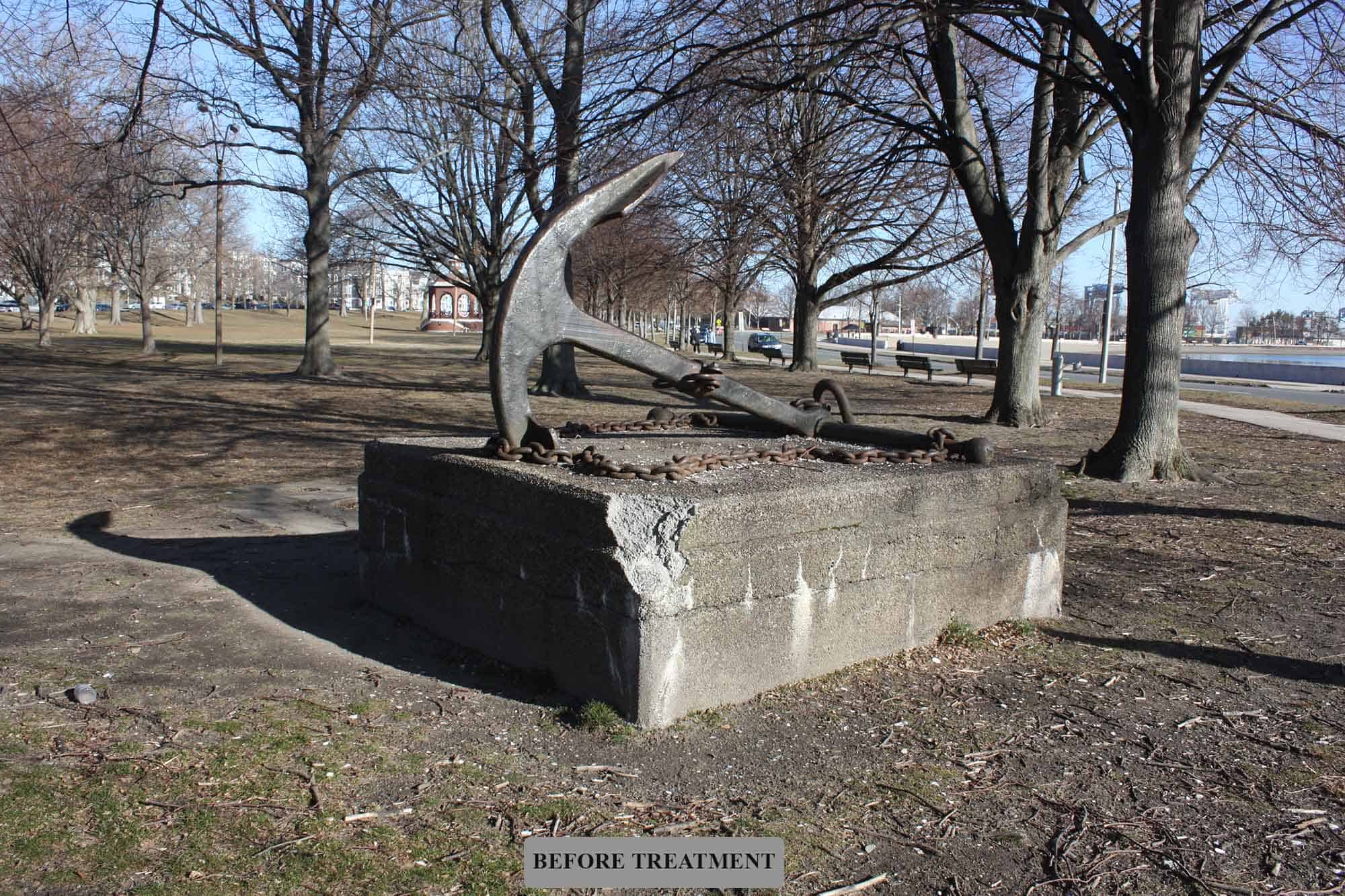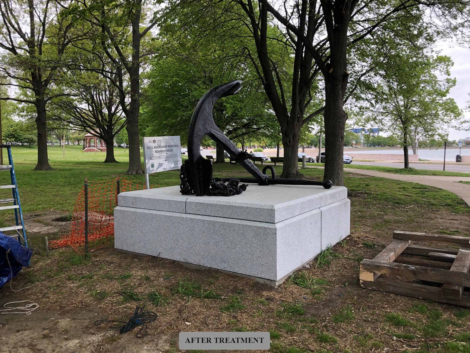 The memorial consists of an anchor and chain from the U.S.S. Kearsarge atop a concrete base and was dedicated in 1930 to Naval officers of the Civil War, the Spanish-American War, and World War I. By 2021, the memorial was in disrepair, and the dedication plaque was missing from the base. Robert’s studio and the Department of Conservation and Recreation determined that the anchor and chain should be restored, the concrete base should be replaced with a new granite base, the missing plaque should be recreated as accurately as possible, and a new plaque should be created to note the restoration and rededication of the memorial. The anchor and chain were deinstalled from the base which was demolished, restored off site, and finally installed on site on a granite base with the same design as the original. The plaques were installed on the base as well.