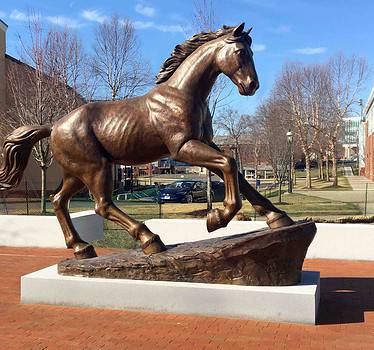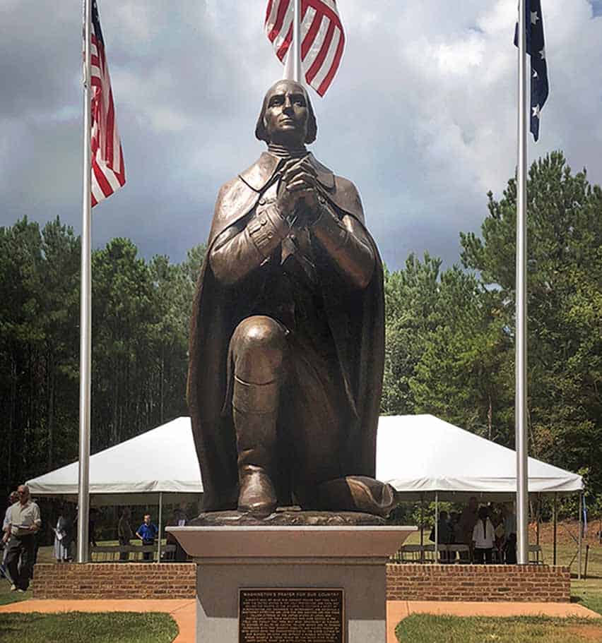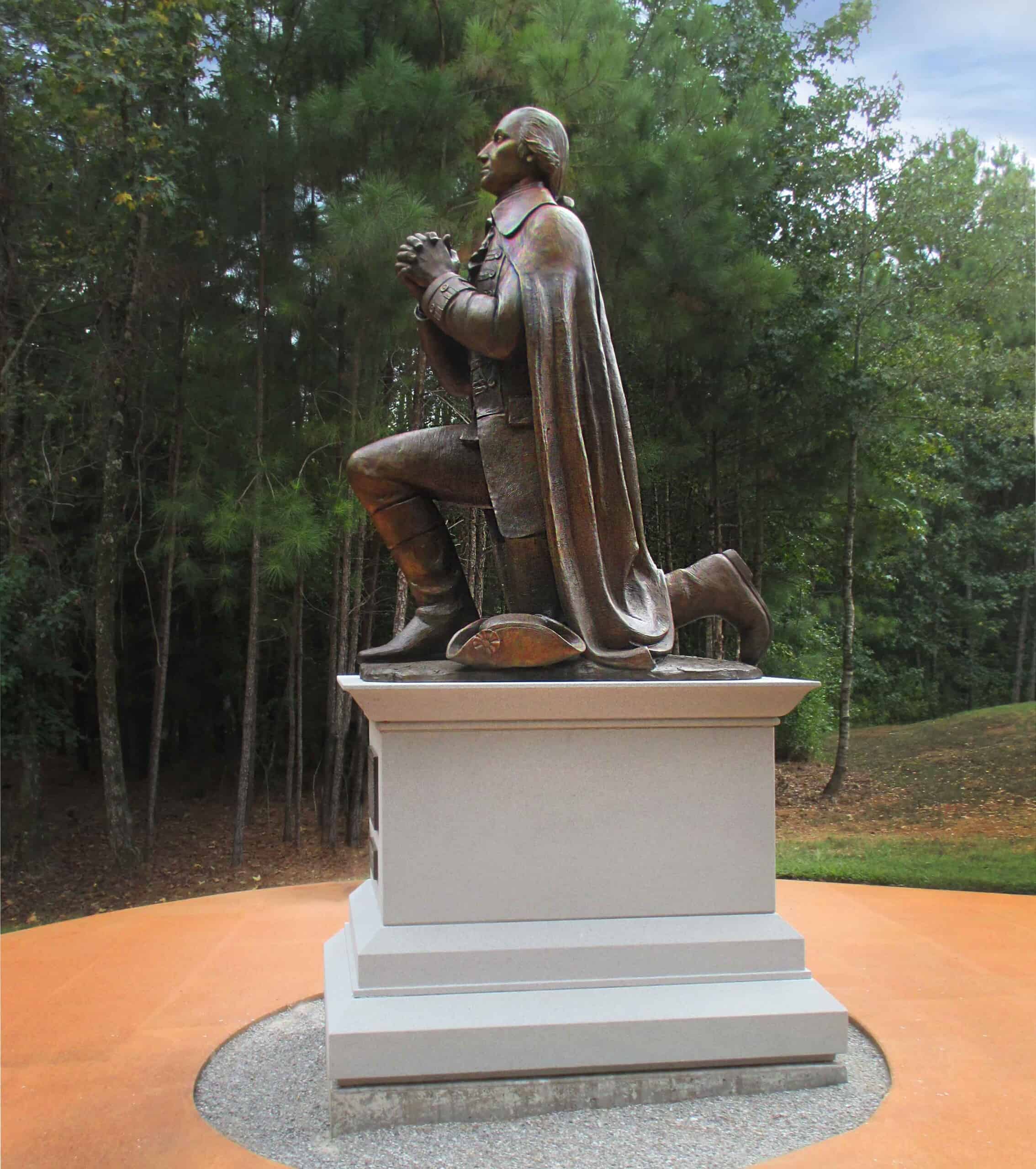 The president and trustees of the American Village looked to Robert Shure, who they had been working with for years on sculpture projects, to design a new artwork. They were inspired by a painting by Arnold Friberg depicting George Washington praying on one knee and desired a sculpture with the same theme for their campus. The bronze figure of Washington is on a knee, hands clasped in prayer, and his face is raised up to heaven. Beside him rests his tricorn hat. He is depicted during the time he was Major General and Commander-in-Chief of the Continental Army. The statue is placed on the American Village’s Freedom Trail.