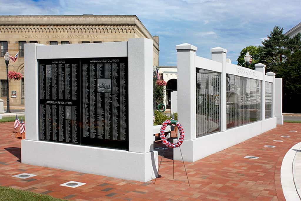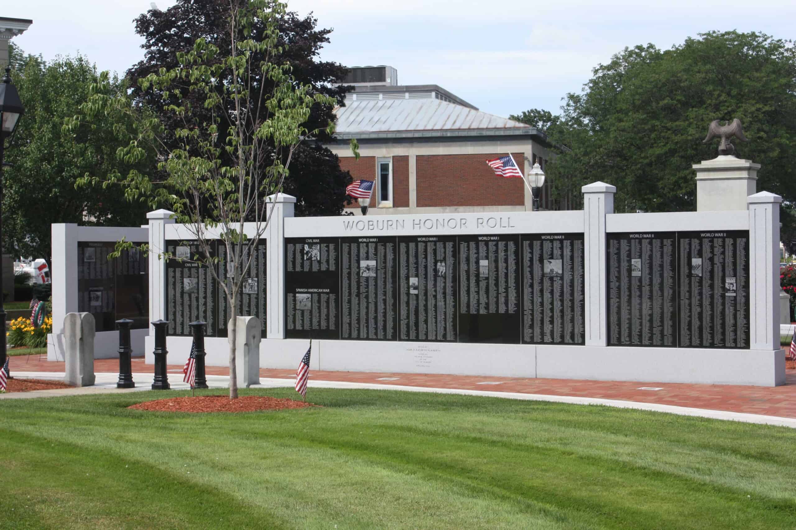 This 52-foot-long total stone memorial was dedicated on Veterans Day 2012. It is made of 31 monolithic blocks of granite weighing over 35 tons. The names of over 12,000 veterans from Woburn, spanning Colonial times to the present day, are laser-etched into the polished, black granite. Images that reflect the history of these conflicts are etched within the fields of names. It is dramatically lit at night with a bank of LED spotlights. As a constant tribute to those who served, it is fittingly located at the central town common. Memorial services are held here annually. The granite and laser-etching was fabricated in Barre, Vermont by Buttura & Gherardi Granite Artisans.
